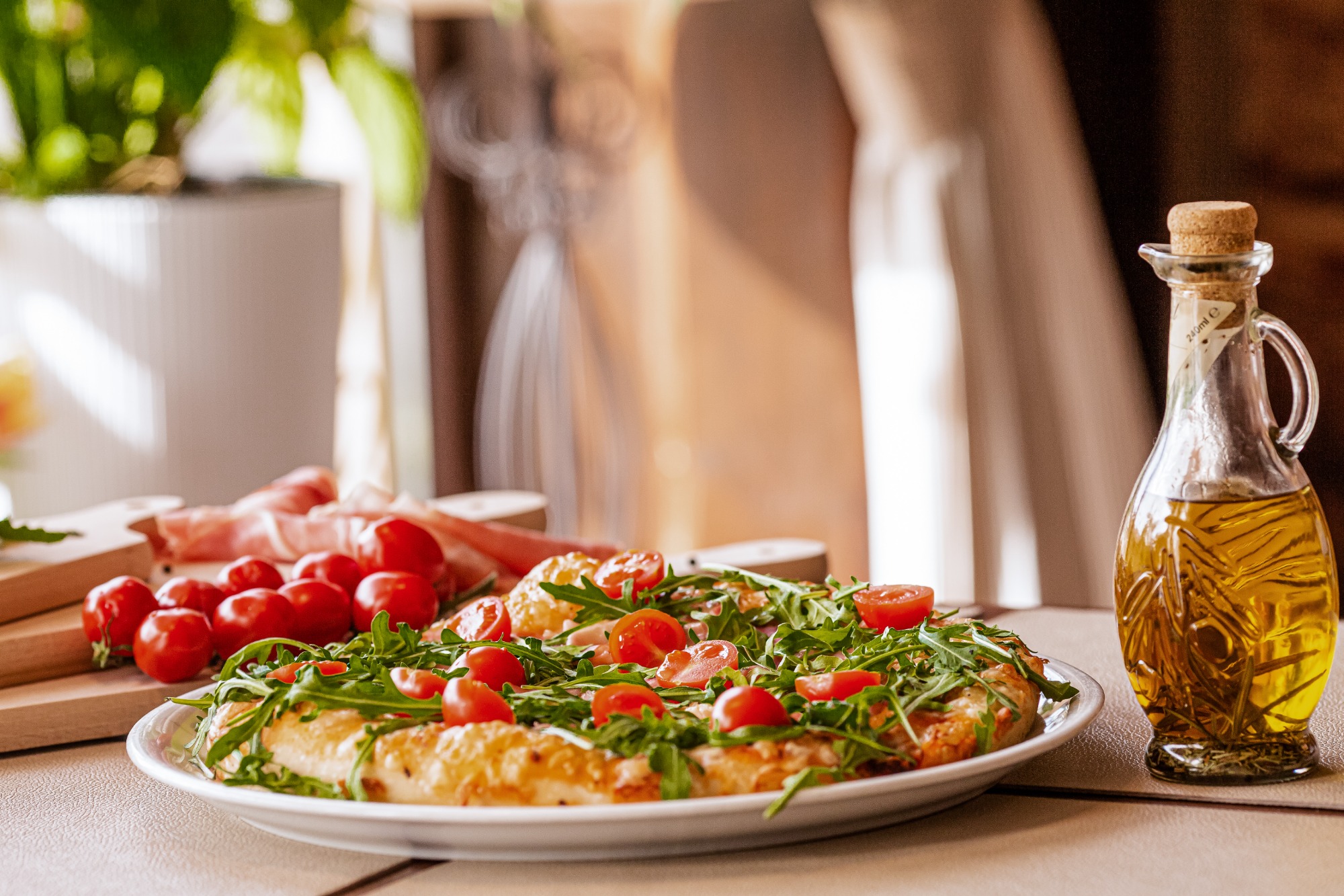 Zapraszamy na smaczną pizzę z szynką parmeńską, rukolą, pomidorkami koktajlowymi i serem.